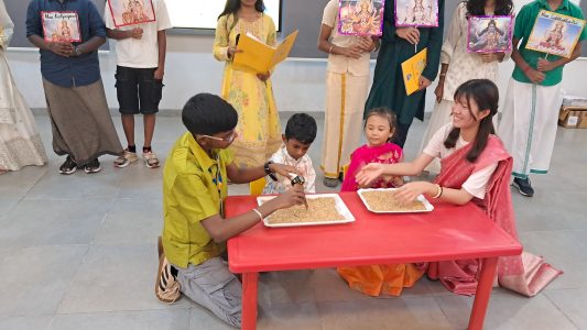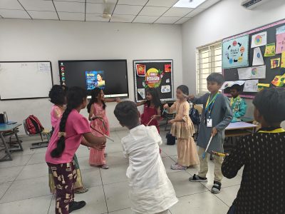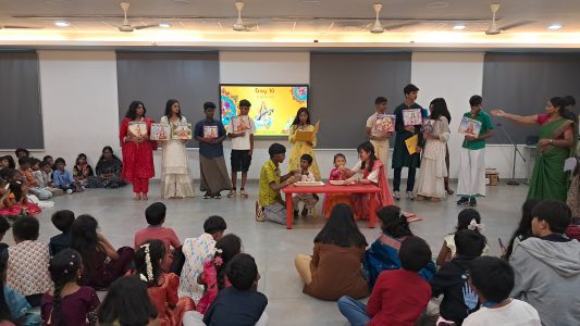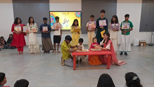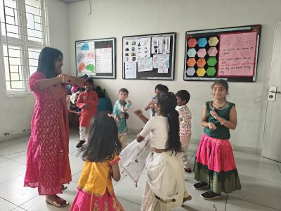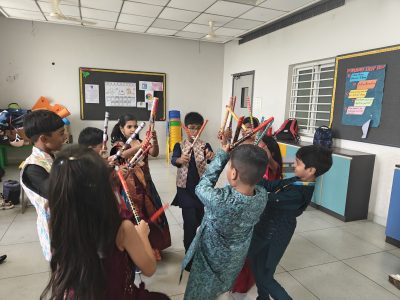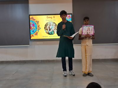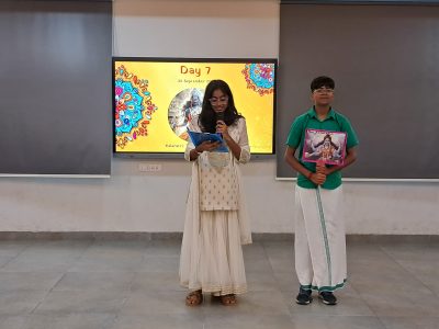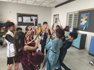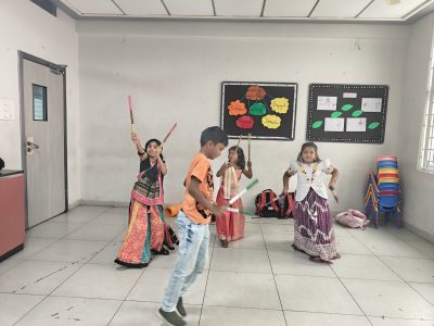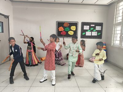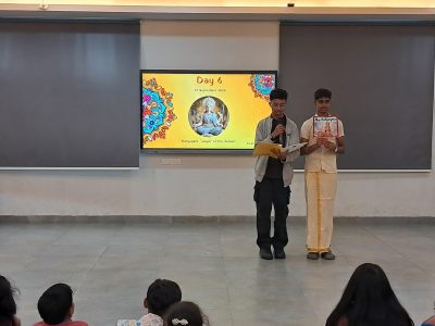 One of the most touching moments was the Vidya Aarambham — the sacred beginning of learning. As the sounds of devotion filled the air, our hearts were moved by the spirit of new beginnings and lifelong learning. The energy soared with a dazzling Dandiya performance, showcasing the joy and rhythm of Gujarat’s Navratri nights. The school choir’s devotional song added a divine melody that echoed long after the final note. From the dramatic Ramlila traditions of North India to the majestic Mysuru Dasara of Karnataka, students took us on a cultural journey across India, sharing the diverse ways Dussehra is celebrated. A beautifully arranged Golu display, featuring mythological dolls and storytelling scenes, offered a glimpse into South Indian traditions and filled the space with heritage and charm.