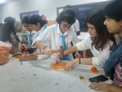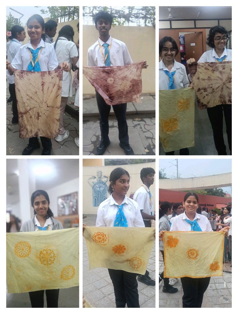 The second half of the workshop ushered us into hands-on experimentation. Tie and Dye turned into a joyful symphony of twisting, folding, dipping, and waiting eagerly to see what patterns would emerge. Eco-printing was an equally delightful surprise — pressing leaves and flowers onto fabric and seeing their shapes transfer so gracefully felt like capturing little pieces of nature forever. Our students were completely immersed, chatting excitedly as they explored new ideas, tested colors and created patterns that were as unique as they were beautiful. The workshop didn’t just teach techniques; it sparked curiosity, encouraged mindful creation, and strengthened our understanding of sustainable fashion.