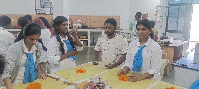 As they stepped onto the NIFT campus, the atmosphere buzzed with energy. The workshop began with a fascinating session on eco-friendly fabric printing techniques. What made it truly special was the emphasis on nature-based dyeing. Instead of harsh chemicals, they were introduced to the magic hidden within everyday fruits, vegetables, and flowers. Beetroot purples, turmeric yellows, spinach greens, marigold oranges — suddenly, our palette expanded into an earthy rainbow crafted entirely by nature. Watching these natural dyes come alive on fabric felt almost like watching tiny miracles unfold.