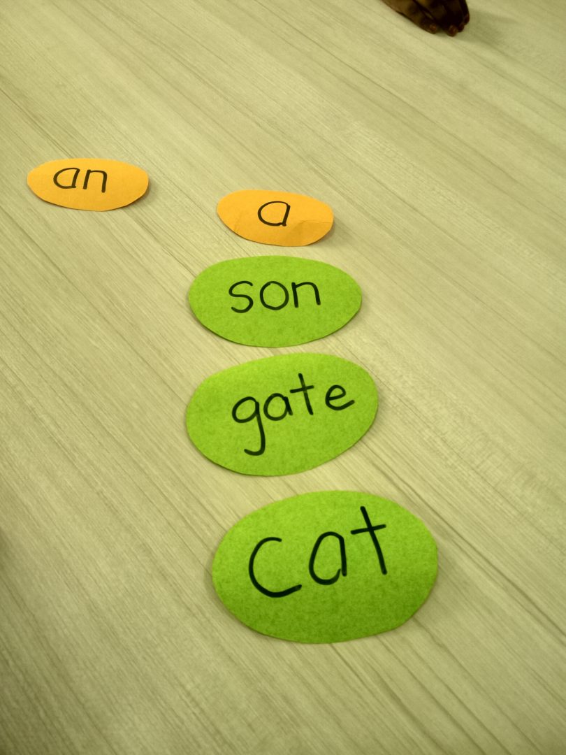 After learning to separate the vowels from the consonants, this week children learnt about articles ‘a’ and ‘an’ and how they should be placed before a word. In ELP 3C we conducted an activity to instill the concept and children were asked to segregate the words based on the rule ‘a’ is followed by words that begin with consonants and ‘an’ is followed by words that begin with vowels.