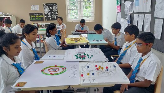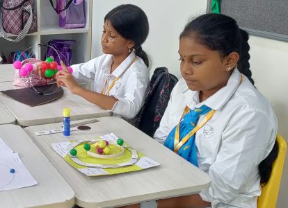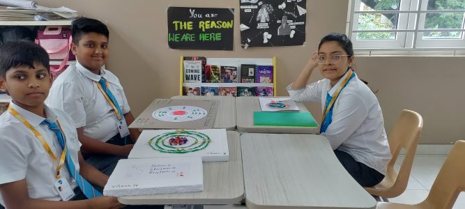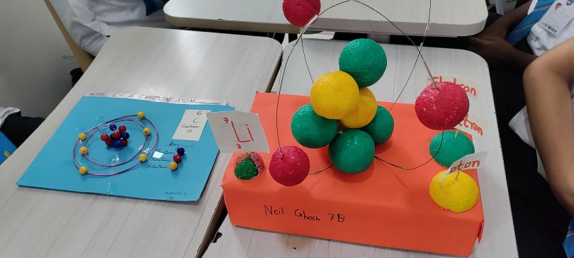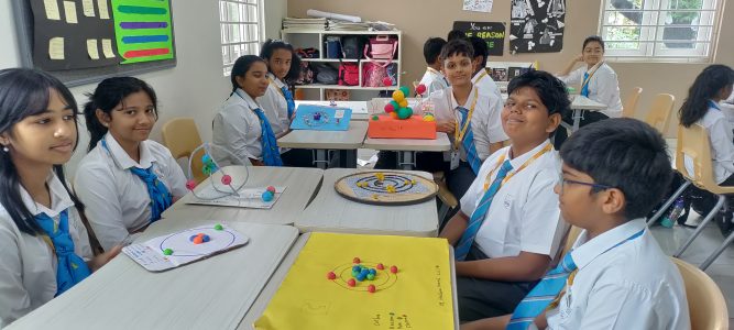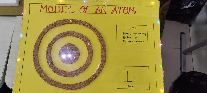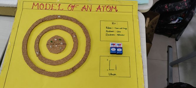 Grade 7 students showcased their outstanding creativity and deep understanding of atomic structure by designing a variety of unique and colorful atomic models. Using materials like vibrant thermocol balls, flexible wires, soft clay, shiny beads, and recycled items, they crafted detailed and visually appealing models of various elements. Each model reflected the students’ thoughtful grasp of protons, neutrons, and electrons, clearly labeled and neatly arranged to represent accurate atomic structures. Some students added imaginative touches like glowing color-coded particles and rotating electron orbits. The engaging activity promoted hands-on, collaborative, and joyful scientific learning.