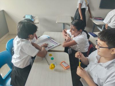 The learners of CIE 5 A and B constructed a hands-on model to explore the workings of the human respiratory system, using balloons, a plastic bottle, a straw, and plasticine dough. The class was divided into four groups for this activity.