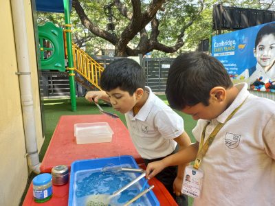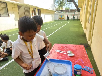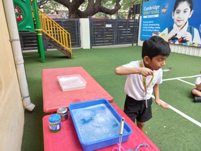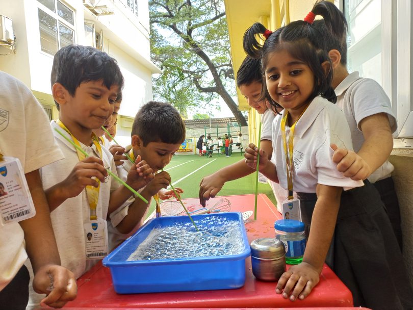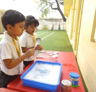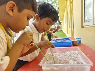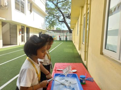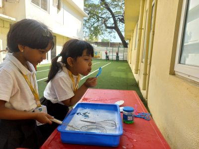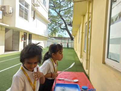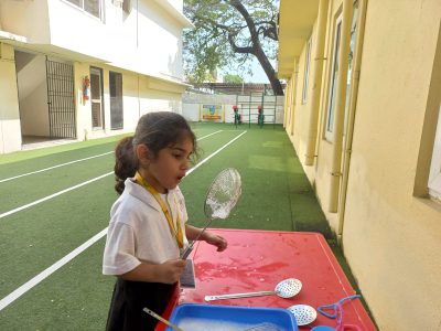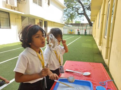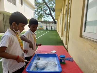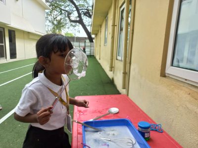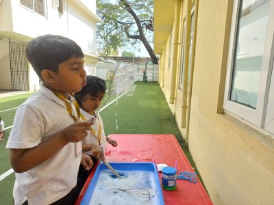 Blowing bubbles develops the small muscles in child’s mouth as they pucker their lips and blow bubbles. Bubbles are magic regardless of your age. This week children of EY2 engaged in blowing bubbles with creative wands like shape wands with pipe cleaner and with kitchen turner and draining spoon. This experiment needs virtually no instructions. First, we prepared bubble solution. Then each one started to explore with kitchen implements to see which one makes the best bubbles by dipping them into the bubble mixing and blowing. The day was whimsical and nostalgic for all of us.