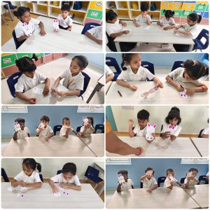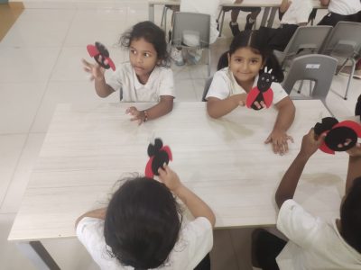 In EY3, children took part in a hands-on craft activity where they created personalized bag tags and finger puppets. They further customized their bag tags by writing their names, fostering a sense of identity and ownership. For the finger puppets, they designed animals such as a rabbit, a honeybee, and a ladybug, carefully assembling each piece to fit their fingers. This engaging activity supported the development of fine motor skills, encouraged creativity, and reinforced early literacy through name recognition. The joy and pride on their faces reflected their excitement in creating something truly their own.