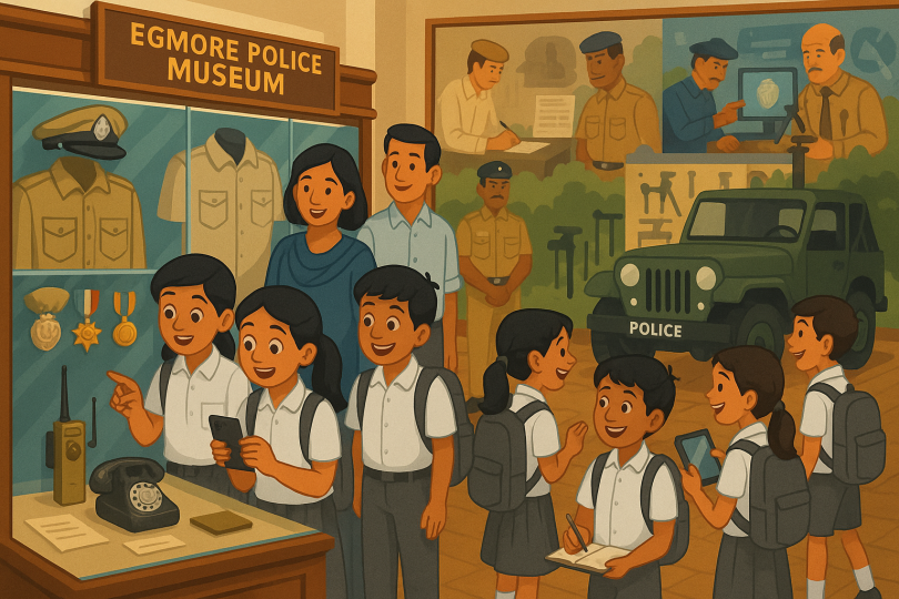 On 25th July 2025, students of Grades 3 to 5 embarked on an exciting educational trip to the Egmore Police Museum, Chennai. The objective of the visit was to help students learn about the evolution of the police force and understand the role of law enforcement in society.As the students walked through the museum, they were fascinated by the exhibits showcasing historic police uniforms, medals, badges, weapons, and communication equipment. The display of vintage police vehicles and old forensic tools sparked their curiosity, leading to many thoughtful questions and discussions.