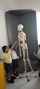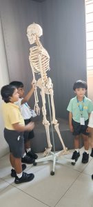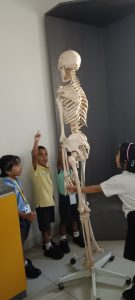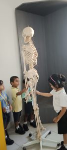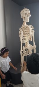 learning about, such as the skull, ribs, spine, and kneecaps. They giggled as they touched the