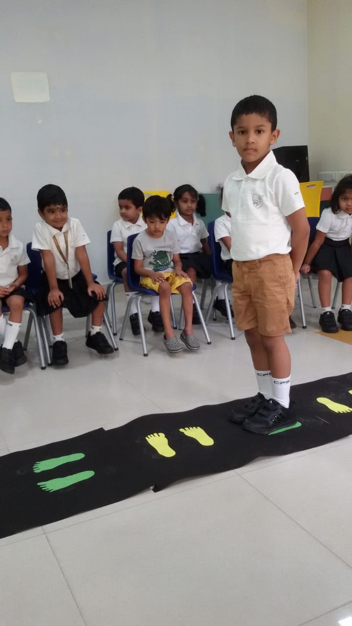 The class of ELP 2 B had a brain tickling gross motor activity where children had to jump on footprints which were placed facing different directions. It was a skill game where decision making, visual discrimination and logic played a vital role. Each time they jumped they had to twist and turn their petite body to fit into the foot print groove.