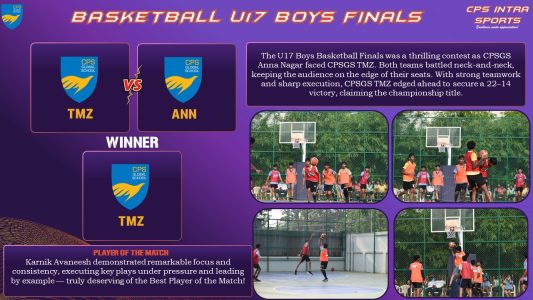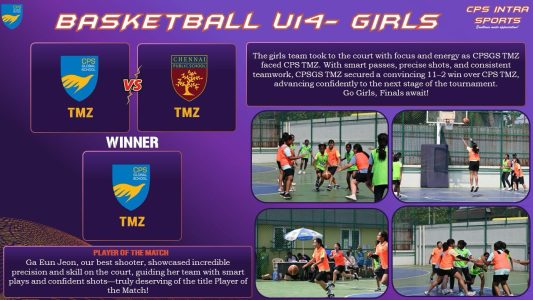 The much-awaited intra-sports extravaganza unfolded on 11 October at CPS Global School, Anna Nagar, with basketball and table tennis lighting up the courts and tables. CPS Global School, Thirumazhisai participated with great enthusiasm and secured several accolades across categories. The school fielded a powerhouse contingent across three basketball categories (Boys & Girls – Under 14, 17, 19) and four table tennis categories (Boys & Girls – Under 12, 14, 17, 19), with a total of 82 participants competing at the vibrant Korattur ground.