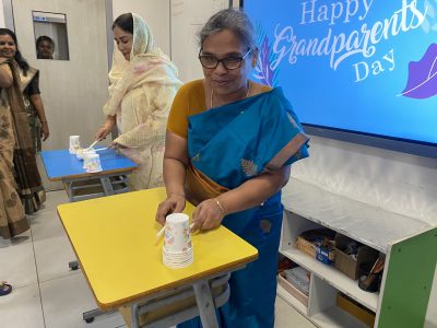 Draining the Ball – Grandparents raced against time to drain balls from a square-shaped box with a hole, adding excitement right from the start. Paper Cup Stacking with Straws – This playful challenge had participants lifting and stacking cups using only straws, bringing plenty of laughter and cheer. Pebble Transfer (Group Game) – Teams showcased teamwork and precision as they carefully transferred pebbles from one cup to another using spoons. Bomb the City (Group Game) – With music, movement, and quick thinking, grandparents placed them between cities named like Madras, Delhi, Kolkata, and Mumbai—the thrill of anticipation as each city was called out made this game a highlight. Slurp the Noodles – A creative and fun activity where participants rolled woolen threads from cutouts of a boy and a girl, pretending to eat noodles without hands, racing to finish first.