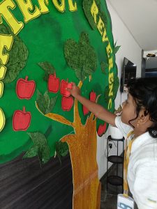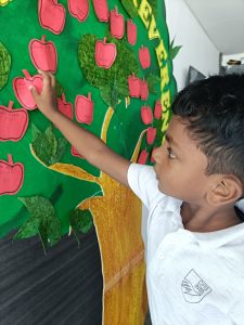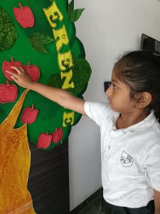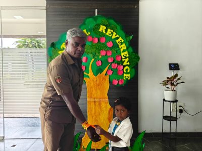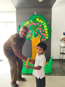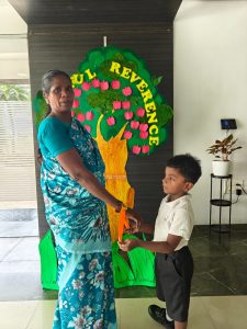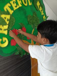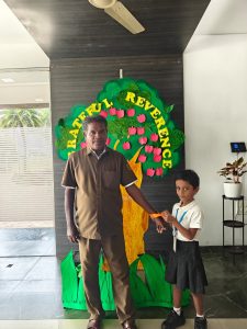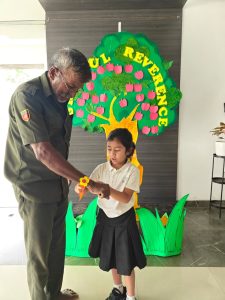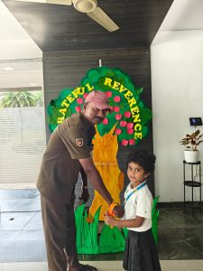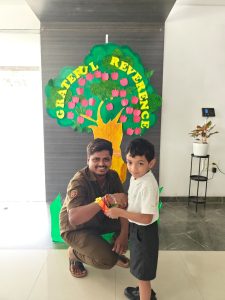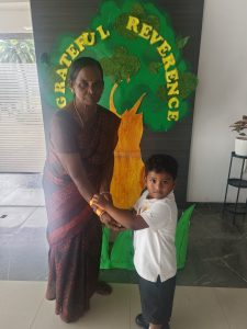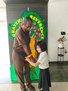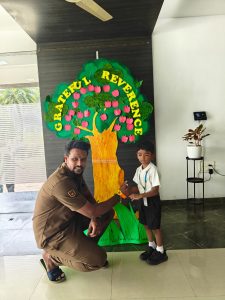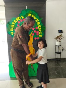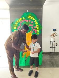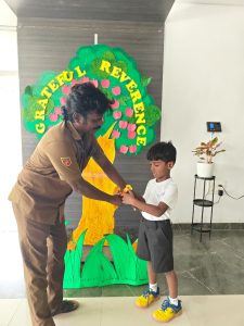 The day began with the children learning the meaning of gratitude through a video about being thankful for the love, care, and blessings around them. Our tiny tots of EY1 and EY2 expressed their gratitude to our caretaking aunties by tying beautiful flower bands with the words “Thank You.” The bright beginners of EY3 showed their appreciation to our security and driver uncles, who take care of their safety from home to school and back every day. The glow on their faces reflected their happiness and surely made the day special for everyone.