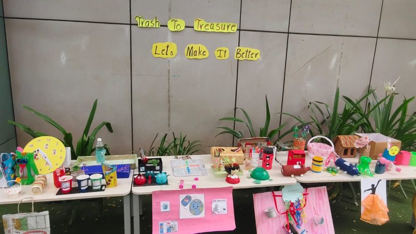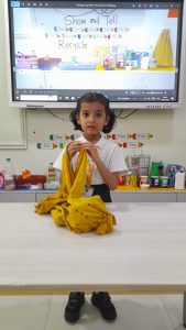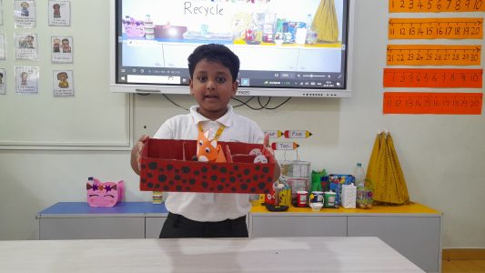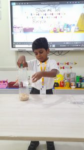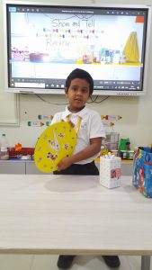 EY 3 children took the stage with a powerful message on recycling. They amazed us with their innovative recycled crafts. From toys made from bottle caps to plant pots crafted from used containers, from pencil holders made from paper cups to table organizers made from cardboard, from bags made from newspapers and old t-shirts to bird feeders made from juice cartons, their creativity shone brightly. There was even a miniature working model of a well, along with an interesting science experiment on air pressure using only plastic bottles. Their projects reflected thoughtfulness and care for the environment, and each child confidently explained how recycling helps the Earth and how their creations were made.