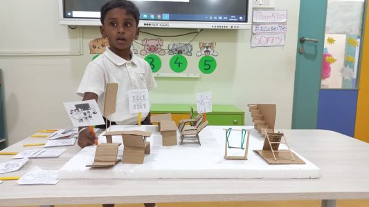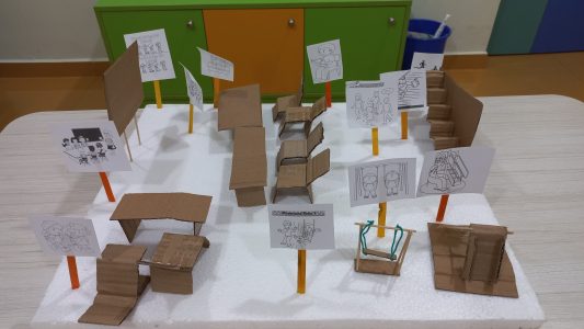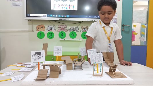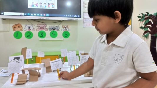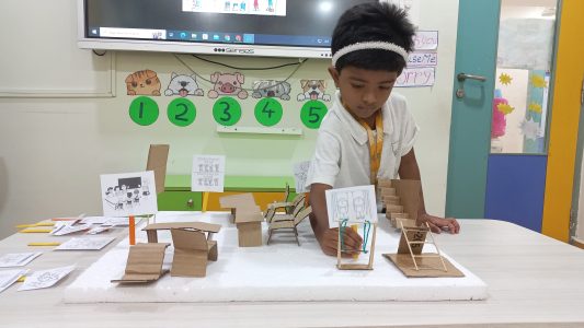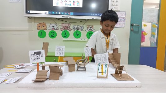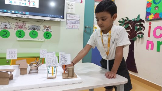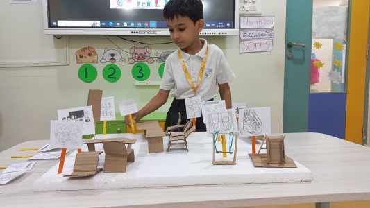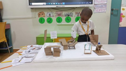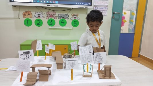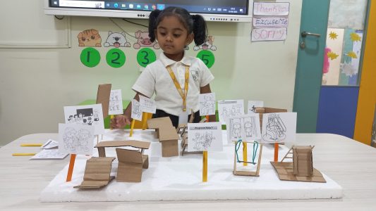 Students in EY 2 C were prepared to understand specific guidelines that will educate them on how to stay safe in the various circumstances they encounter every day. through the setup of a tiny classroom and playground model. They put images of good behavior next to the appropriate spots.