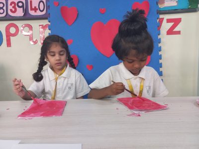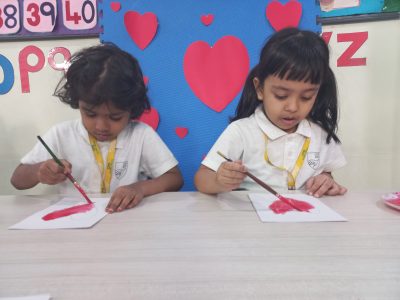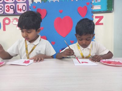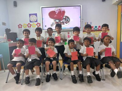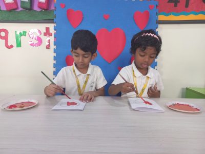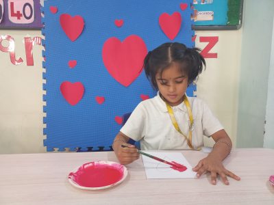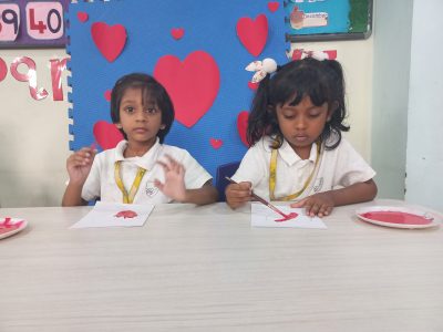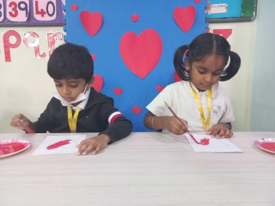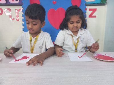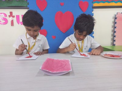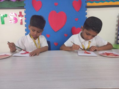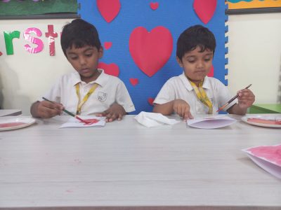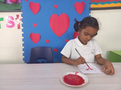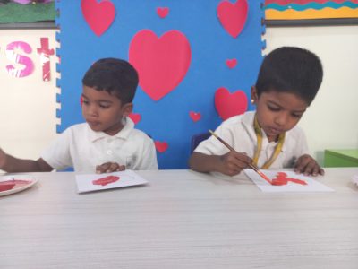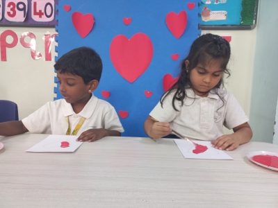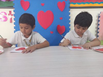 EY 1 kids get to know about what Valentine day is through short stories and they stick a stone on the heart shaped bracelet which represents a symbol of love.