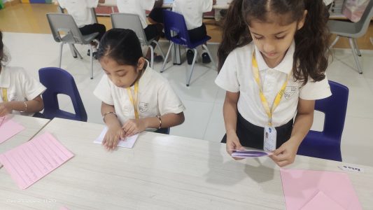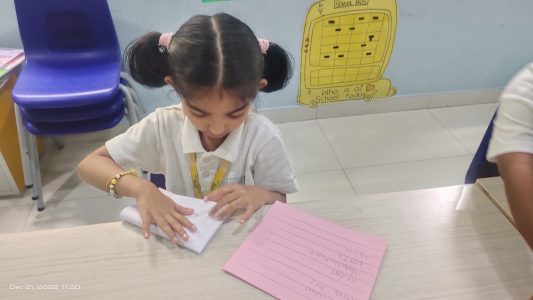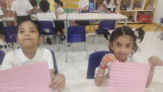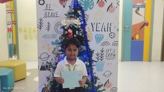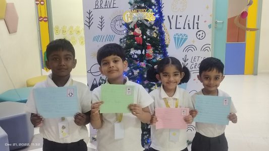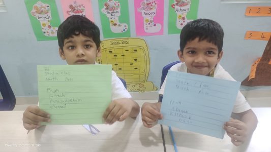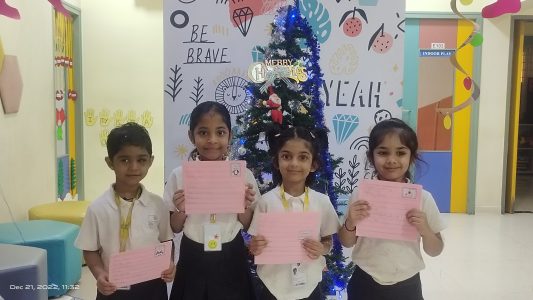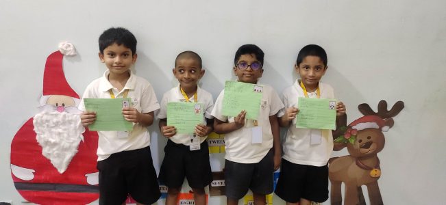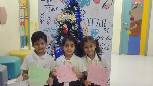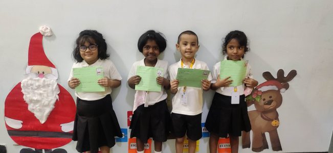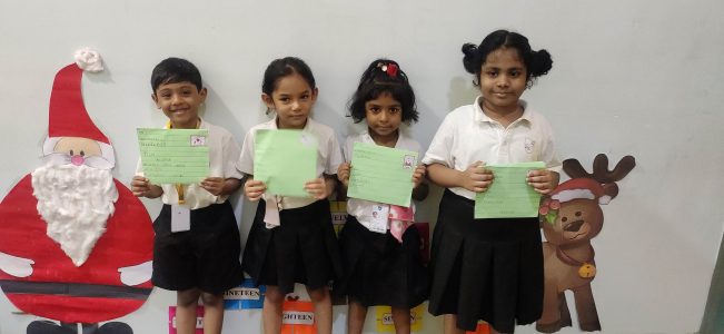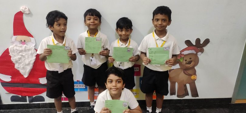 Our EY 3 tiny tots wrote a letter to Santa. They wrote their name, age, how this year has been to them and last but not least they wished Santa for their favorite toys. Some even wished toys for their loved ones too. This shows how they care and share with others. The Letters were so attractive because of their coloring skills. Kids covered their letters with envelopes and wrote “To Santa, North Pole” on the envelope. On a happy note let’s all ask Santa for lots & lots of happiness !!