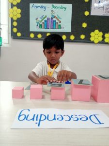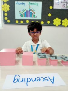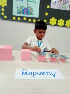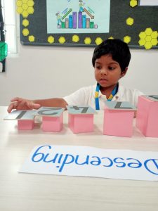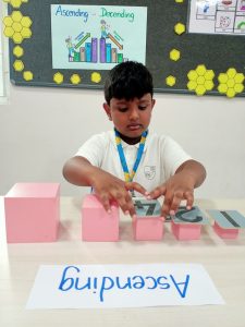 The ELP 3 class of CPS Global School, Thirumazhisai embarked on an exciting journey of exploration: the art of sorting numbers in ascending and descending order. Each learner was presented with a set of five assorted numbers and entrusted with the task of arranging them on the pink tower, from largest to smallest and vice versa.