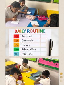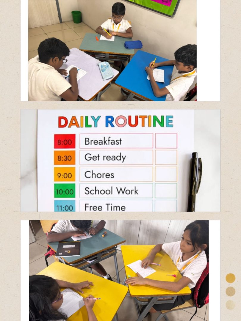 A daily routine helps us stay organized, develop good habits, and manage our time better—especially for young learners like Grade 3B students. One of the key ideas that students start learning at this level is how to understand time intervals, which means recognizing how long an activity takes and planning their day accordingly. Creating and following a daily routine using time intervals helps Grade 3B students become more organized, confident, and independent. It also supports their academic learning by connecting math concepts (like time) to real-life situations.