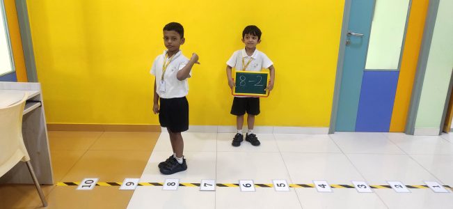 Number Line games are so much fun! Here at EY3 segment we learnt subtraction using a life size number line where kids have to read out the subtraction equation aloud and perform subtraction by jumping backwards. This helped our children to understand the concept easily. This is how we keep our Math classes lively and interactive.