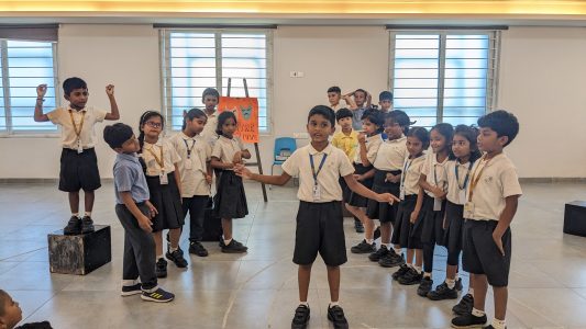 In the lower grades, such as Grade 1 and 2, students were engaged in playful yet impactful improvisations, tackling themes like environmental conservation and problem-solving.
