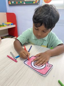 Early Years 2 added a personal touch by colouring a camera illustration that featured their own photograph, making it extra special. They also went on an exciting colour hunt around the campus—matching colour cards with real-world objects and turning learning into joyful play.