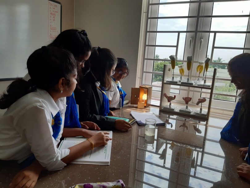 Students of grade CAIE 7A performed their Assessment in the form of Investigation on the rate of Photosynthesis under different lighting conditions and understood photosynthesis cannot happen without the light or Carbon dioxide using a Leaf Disk Array. Leaf disks normally float, however when the air spaces are infiltrated with carbon dioxide, the overall density of the leaf disk increases and the leaf disk sinks. When sodium bicarbonate is added to the water, the bicarbonate ion acts as a carbon source for photosynthesis causing the leaf disks to sink. As photosynthesis proceeds, oxygen is released into the interior of the leaf, which changes its buoyancy causing the disk to rise. Since cellular respiration is taking place at the same time in the leaf, the oxygen generated by photosynthesis is consumed. As a result, the rate that the disks rise is indirectly proportional to the net rate of photosynthesis.