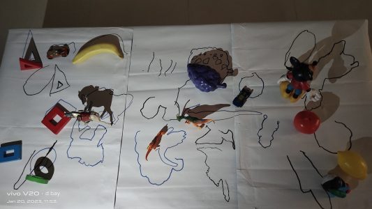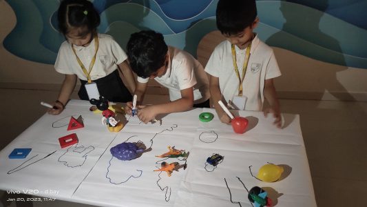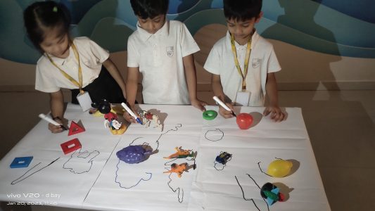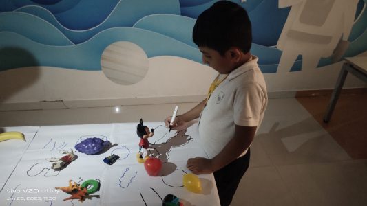 Exploring light and darkness created awe for our children. They played shadows, creating images and stories. Based on the children’s observations about shadows, we discussed the meaning of transparent, translucent, and opaque in relation to the materials they were investigating. In addition, our little explorers had fun doing shadow art where they had to draw around a shadow cast by a toy.