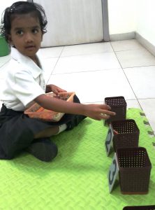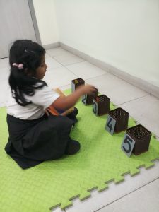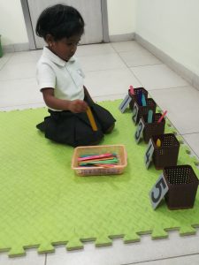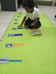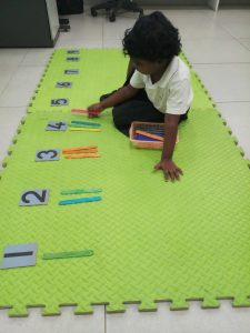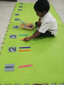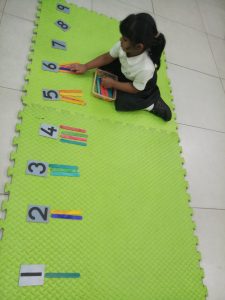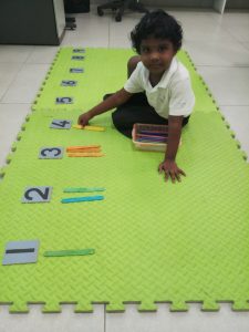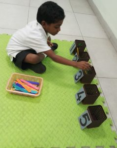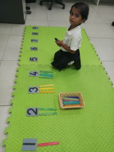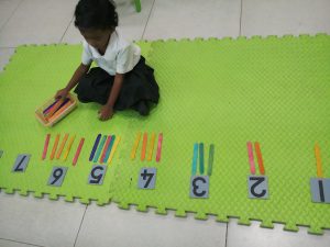 After a demo from the facilitator, first the children placed the number cards in the numerical order. The coloured pop sticks were used as counters for this activity. Children were made to understand that each pop stick represented one unit. The little ones read the number on the card and counted and kept the correct number of pop sticks on each card. It was a great opportunity for the children to practice counting out loud, recognise, name numbers and also develop an understanding of the value of numbers.