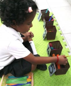 Popsticks are fun anytime. ELP 2 had a fun activity with popsticks to get them familiarised with numbers and to help them understand the quantity of numbers. The counting activity used number cards and coloured pop sticks.  The cards and counters bring the abstract to the concrete, allowing the children to feel the units as they count.