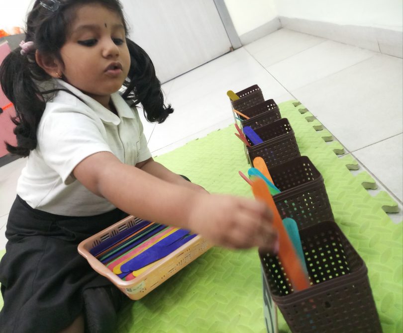 After a demo from the facilitator, first the children placed the number cards in the numerical order. The coloured pop sticks were used as counters for this activity. Children were made to understand that each pop stick represented one unit. The little ones read the number on the card and counted and kept the correct number of pop sticks on each card. It was a great opportunity for the children to practice counting out loud, recognise, name numbers and also develop an understanding of the value of numbers.