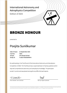 At CPS Global School, we take immense pride in nurturing young minds to dream big and aim high. One such shining example is Poojita Sunilkumar, a dedicated student of IBDP Year 2, who has made our school proud with her outstanding performance in the International Astronomy and Astrophysics Competition (IAAC) 2025.