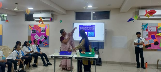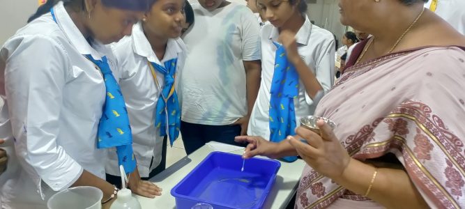 Lower secondary students enthusiastically explored the fascinating concept of surface tension through a series of engaging, hands–on, and visually captivating science activities. They were amazed to see how multiple shiny coins could be gently added to a beaker filled to the brim with clear water—without causing it to overflow—demonstrating the remarkable strength of surface tension.