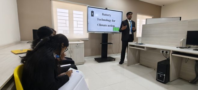 A review session was conducted with Dr. Ancy, during which teams presented diverse and thought-provoking topics, including environmental finance, global water security, and advancements in battery technology. Students demonstrated strong critical thinking by proposing innovative solutions such as green employment initiatives, AI-based climate prediction, and advanced energy storage systems. Dr. Ancy offered constructive feedback, research recommendations, and guidance on academic writing, paper formats, and journal submission processes.