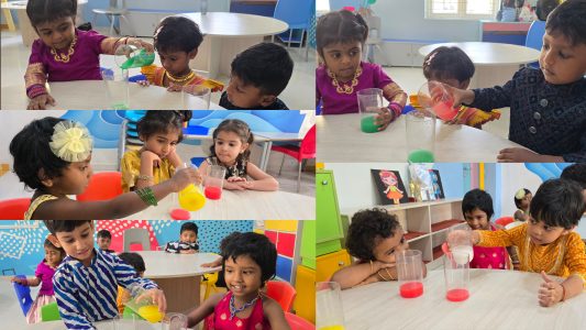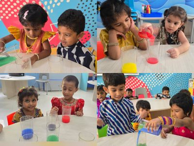With lots of pouring, stirring, and proudly naming their creations, the children were fully engaged in this hands-on exploration. The activity supported colour recognition, strengthened hand coordination, and sparked curiosity through playful learning. It was a delightful experiment filled with joy, laughter, and bright, colourful discoveries!