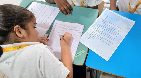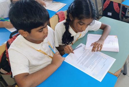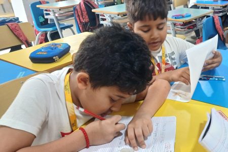 One such hands-on activity is “Unlocking the Power of Personal Reflection: Teaching Diary Writing.” Our charming, young minds of Grade 3 participated in this activity with enthusiasm and spirit. The students were divided into five teams, each provided with a sample diary entry template. They read, discussed, brainstormed, and understood the features and the format of a diary entry. Each team then shared their insights by outlining their understanding on a provided piece of paper. Finally, a colourful empty template was given to each student to pour their experiences using emotive languages.
