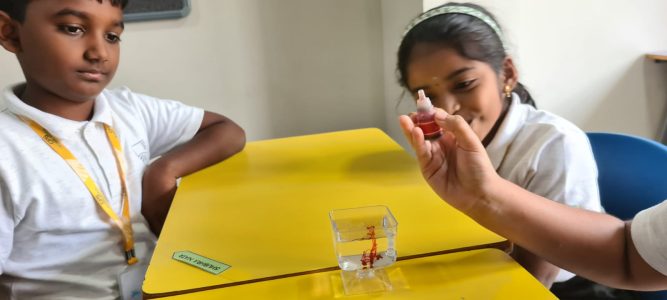 Our CIE 3 students had a fascinating experience watching how liquid particles behave. They put drops of food dye into a container and saw how the color spread through the liquid without any stirring. This simple experiment showed how liquids mix on their own, revealing the hidden beauty of fluid movement.