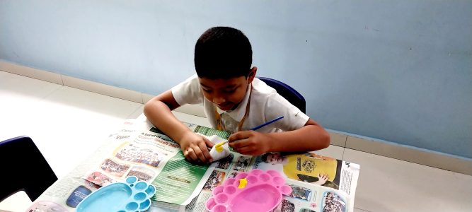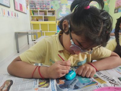 The session began with children exploring smooth pebbles—feeling their textures, comparing sizes, and wondering aloud what each pebble could become. With paints, brushes, and a lot of imagination, these ordinary stones soon transformed into colourful animals, cheerful faces, flowers, and imaginative designs.